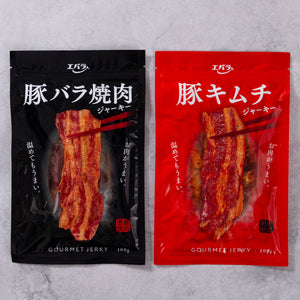 豚バラの旨みを存分に味わえる「豚バラ焼肉ジャーキー」と、ピリ辛旨辛だれで仕上げた「豚キムチジャーキー」の2種をセットにしました。