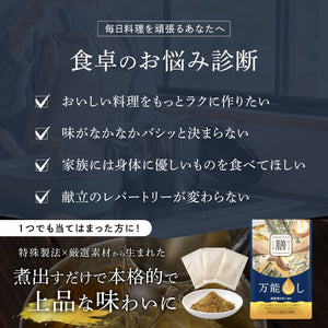 7種の厳選素材を黄金比でブレンドした、風味豊かな和風だしパックです。