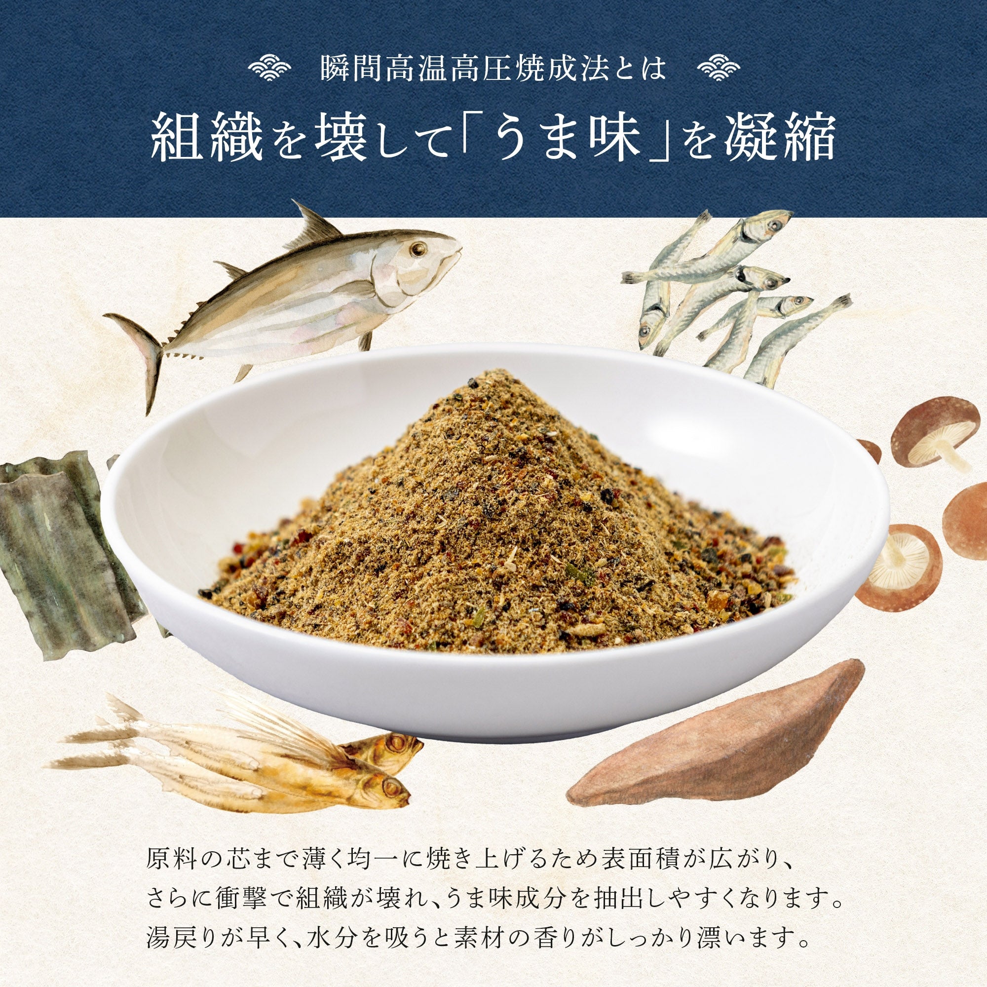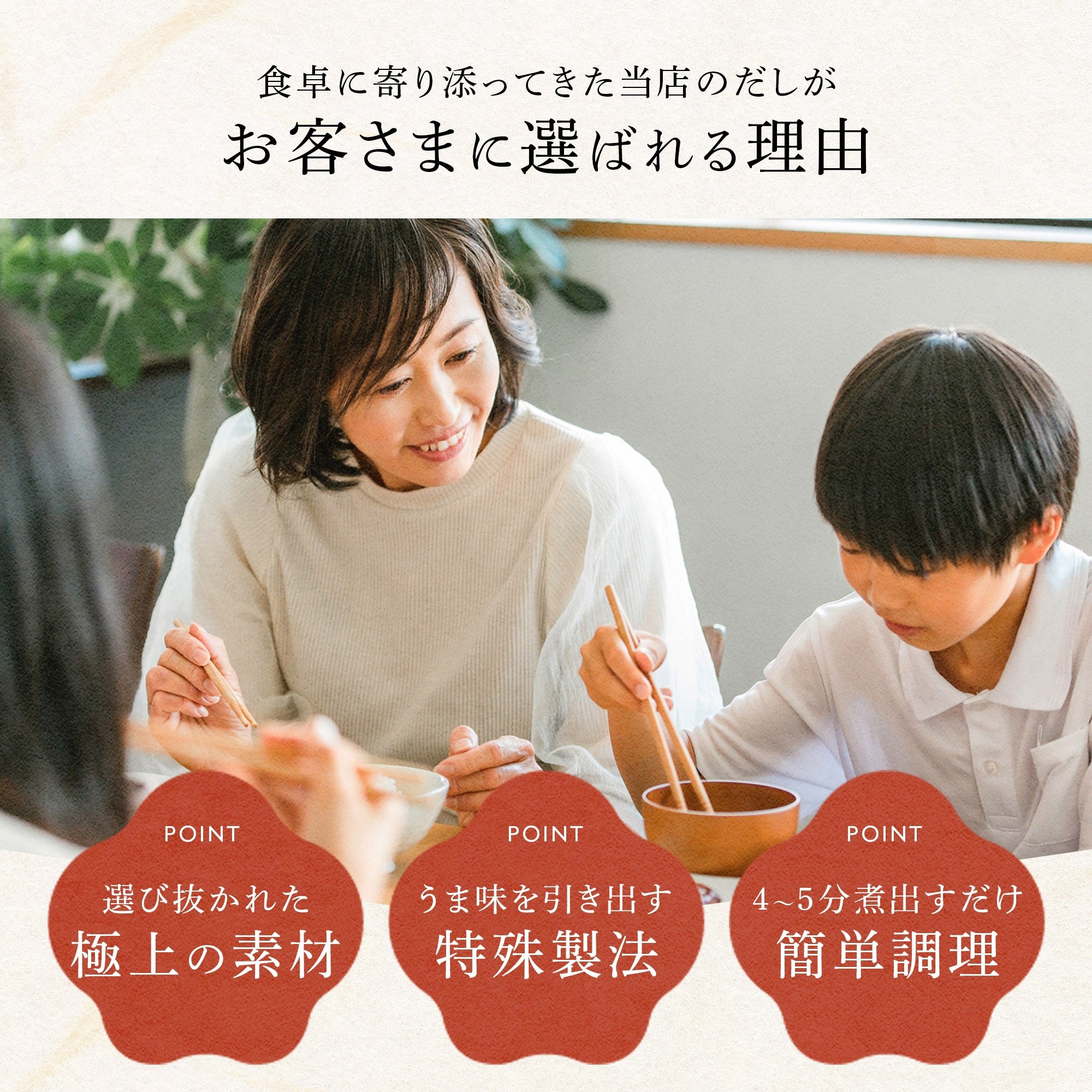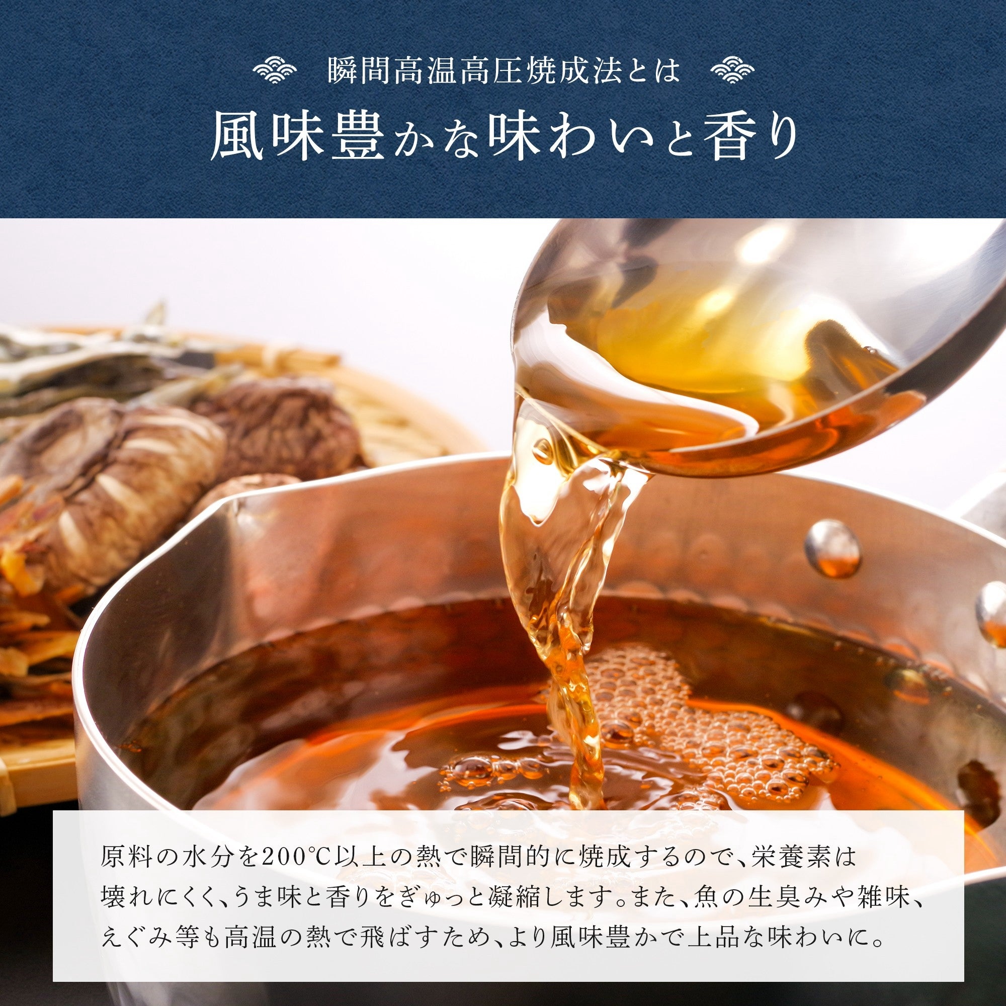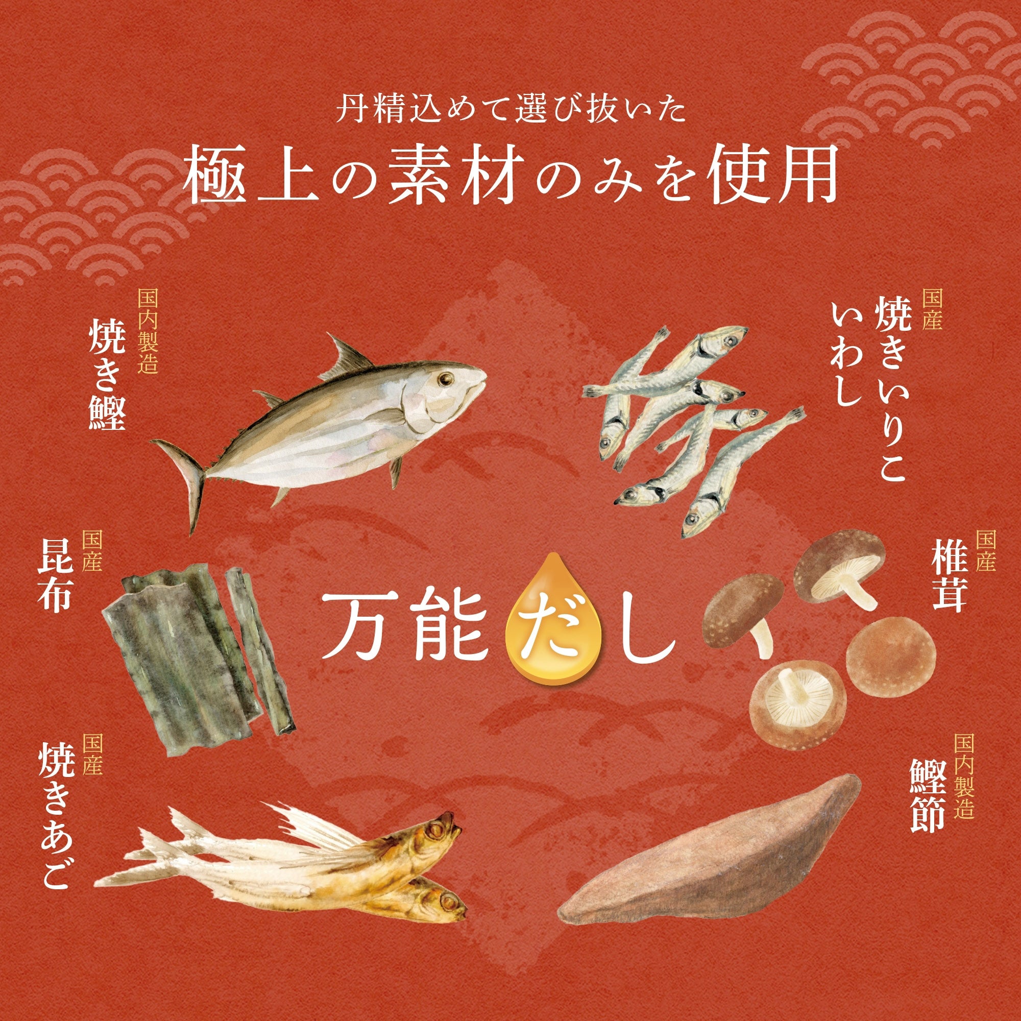 焼きあご、かつお節、昆布など、国産・国内製造の素材のみを使用し、