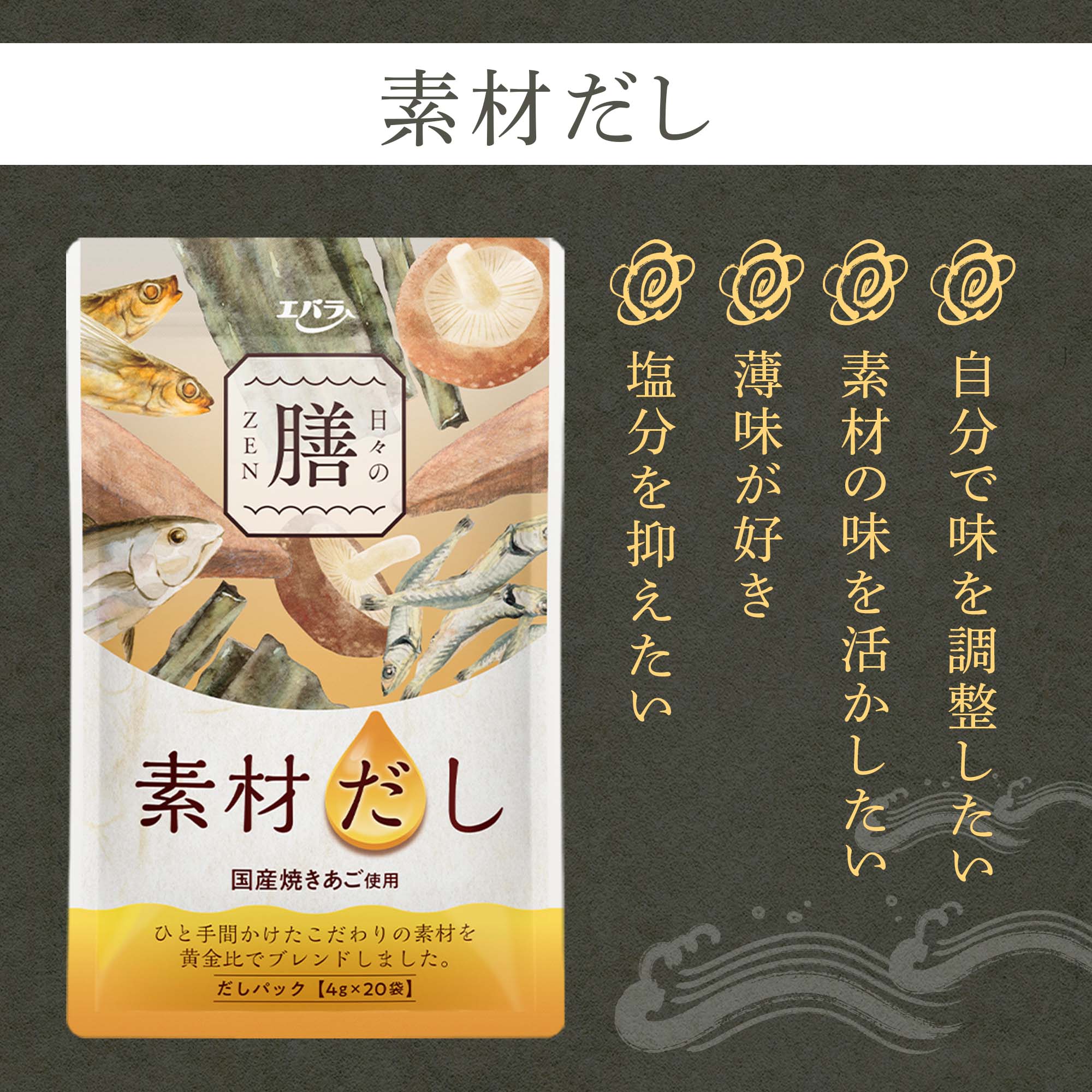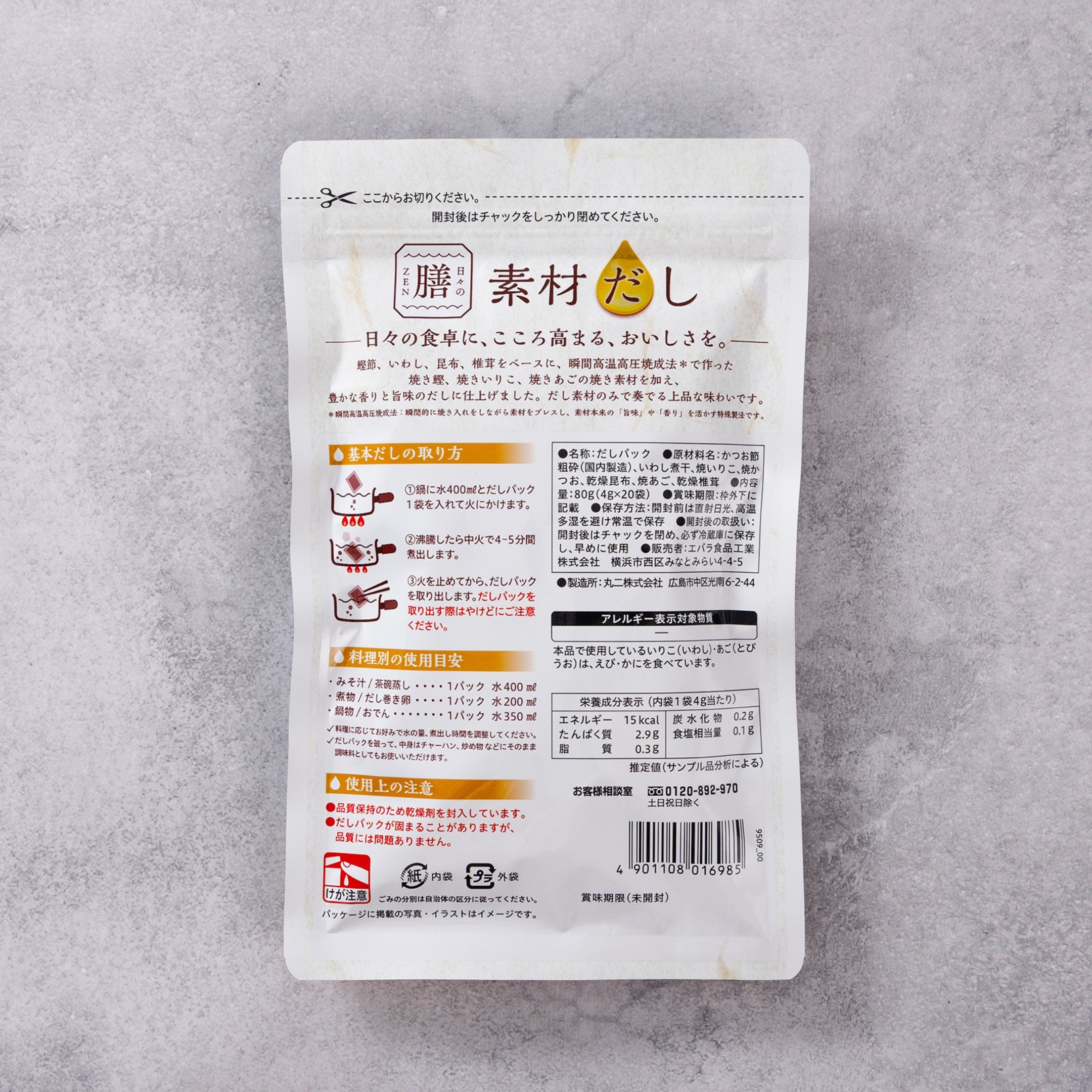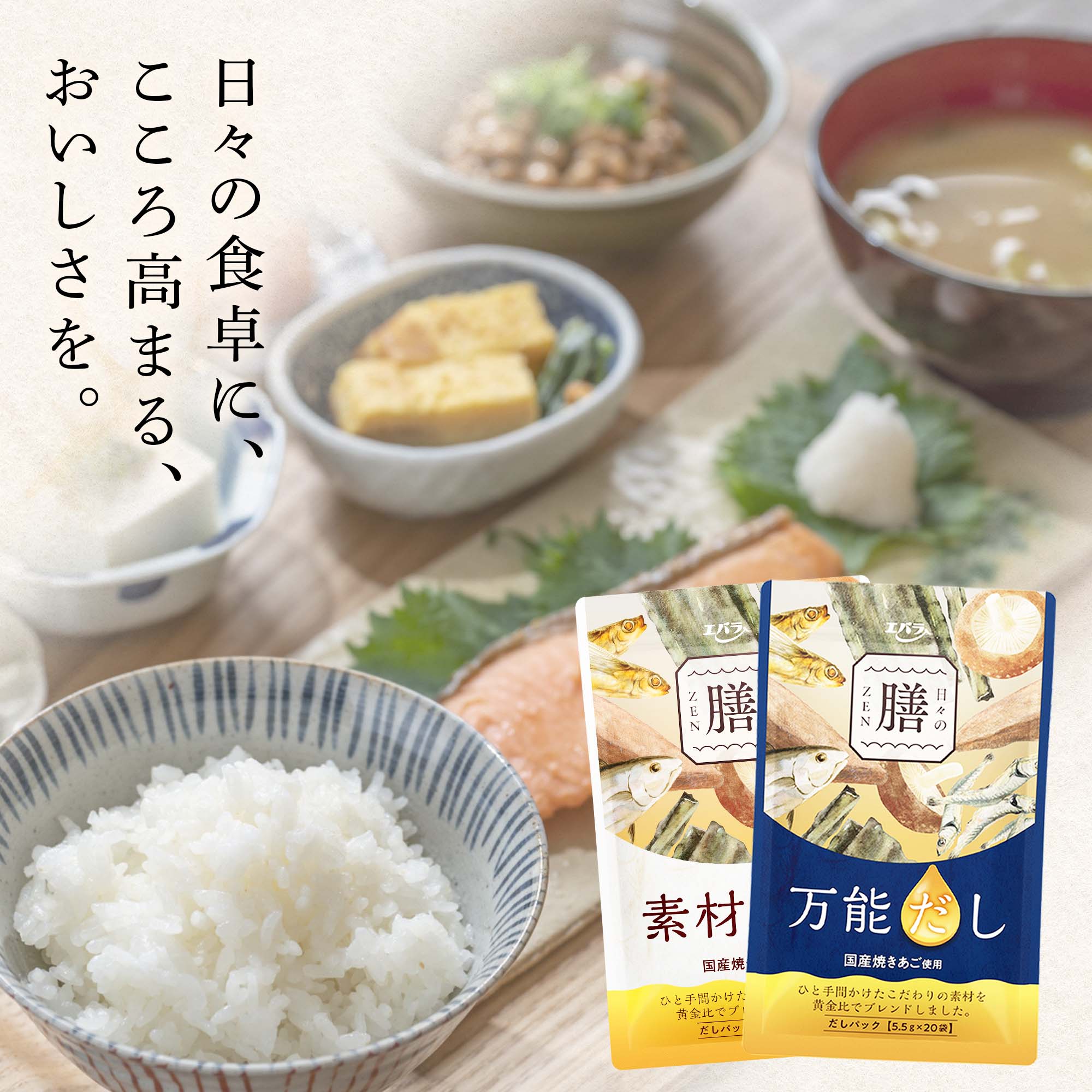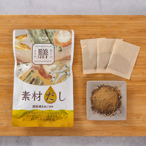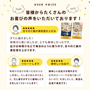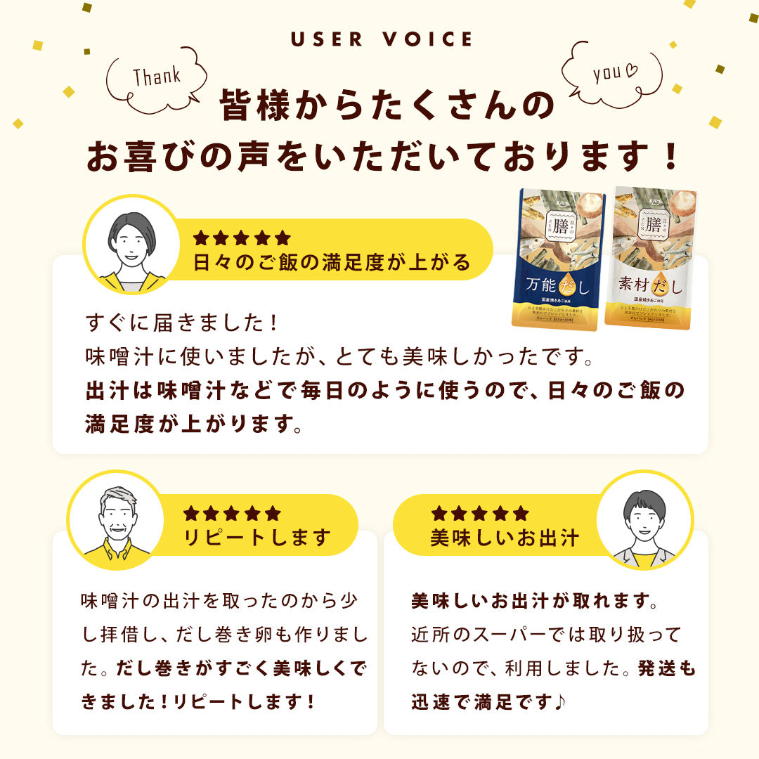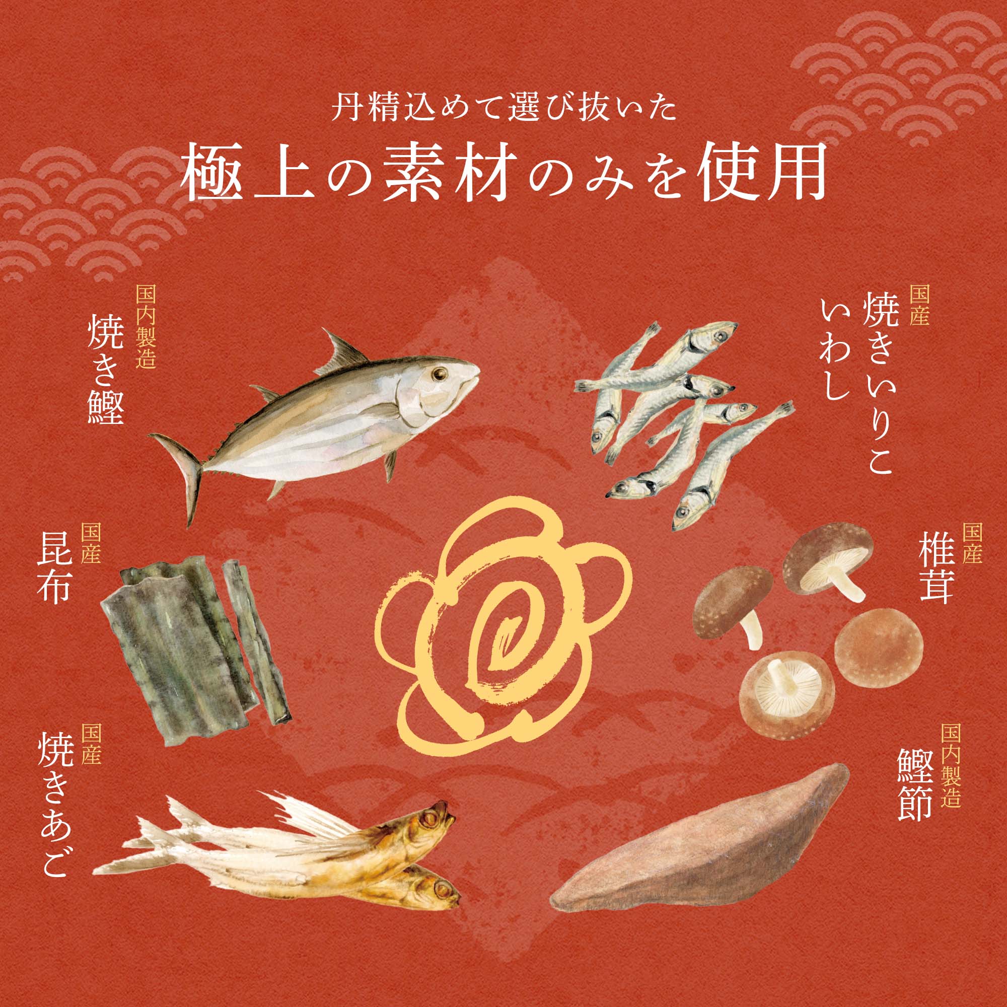 焼きあご、かつお節、昆布など、国産・国内製造の素材のみを使用し、